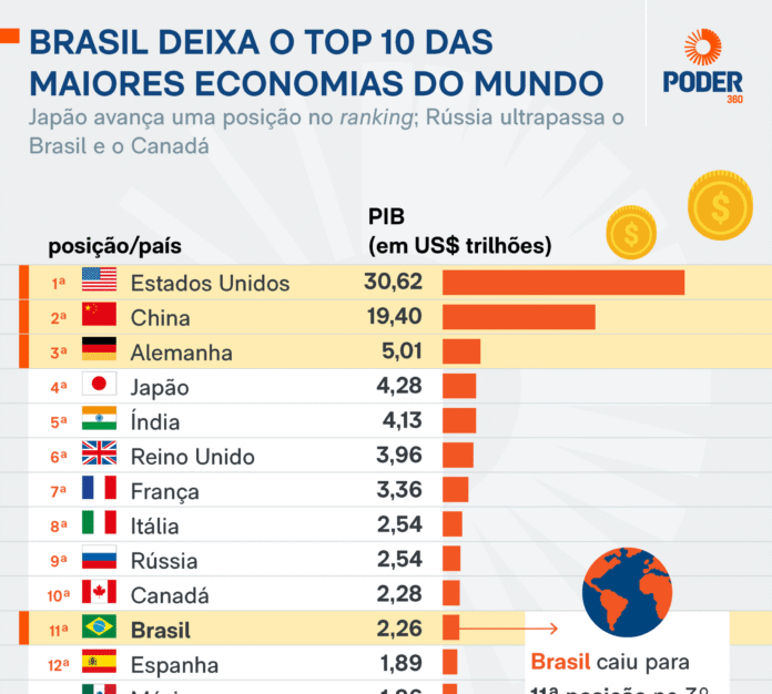 O Brasil deixará o grupo das dez maiores economias do mundo em 2025, de acordo com levantamento da Austin Rating baseado em projeções do Fundo Monetário Internacional (FMI). A estimativa indica Produto Interno Bruto (PIB) de US$ 2,26 trilhões para o país, valor que o coloca na 11ª colocação mundial.