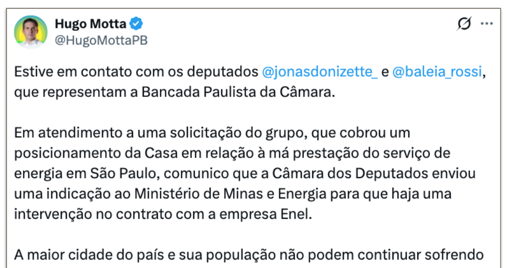 Brasília – O presidente da Câmara dos Deputados, Hugo Motta (Republicanos-PB), informou nesta quinta-feira (18.dez.2025) que a Casa enviou ao Ministério de Minas e Energia (MME) uma indicação que solicita intervenção no contrato da Enel, concessionária responsável pelo fornecimento de eletricidade na Grande São Paulo.