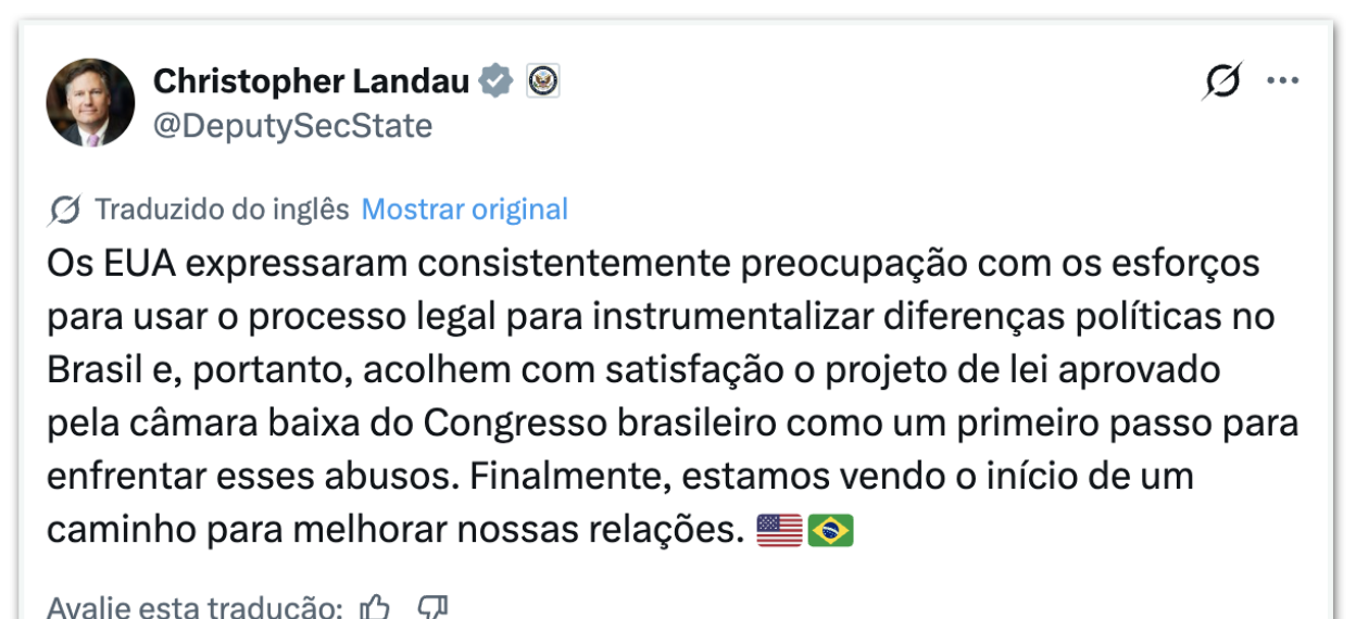 Brasília – O vice-secretário de Estado dos Estados Unidos, Christopher Landau, elogiou a Câmara dos Deputados pela aprovação do Projeto de Lei da Dosimetria e afirmou, em publicação nas redes sociais feita na quinta-feira (11.dez.2025), que Washington “saúda” a medida como primeiro passo para enfrentar o que classificou como uso político do sistema judicial no Brasil.