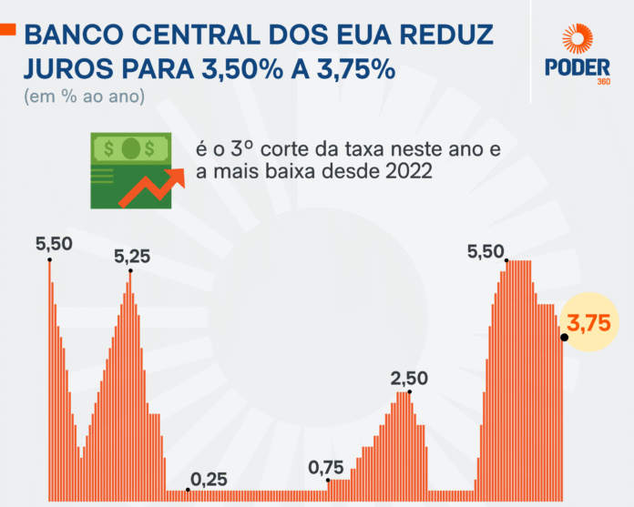 O Federal Reserve reduziu nesta quarta-feira, 10 de dezembro de 2025, a meta da taxa básica de juros norte-americana para o intervalo de 3,50% a 3,75%. O corte de 0,25 ponto percentual foi aprovado por nove integrantes do Comitê Federal de Mercado Aberto (Fomc).