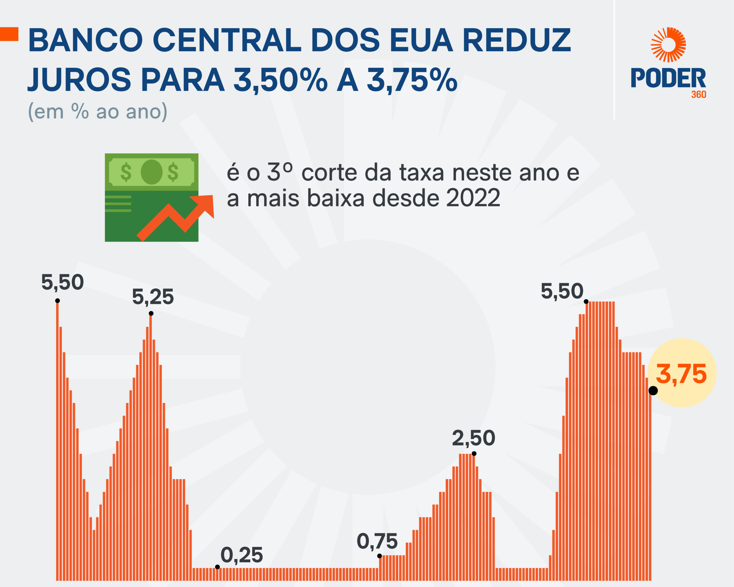 Esta é a terceira queda seguida nos juros desde que Miran assumiu vaga na diretoria do Fed. Em setembro, a autoridade já havia reduzido a taxa em 0,25 ponto, para 4,00% a 4,25%, depois de cinco reuniões consecutivas de manutenção no intervalo de 4,25% a 4,50%.
