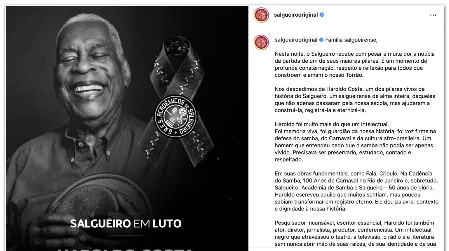Com sete décadas de carreira dedicadas ao teatro, à televisão e à memória do samba, Haroldo Costa deixa um legado consolidado na cultura popular brasileira.
