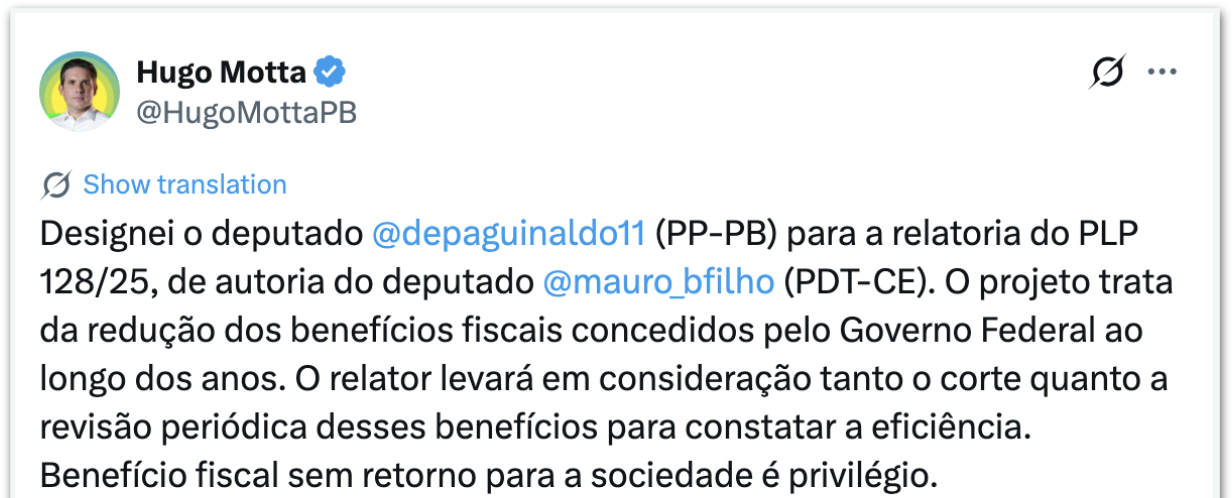 O presidente da Câmara dos Deputados, Hugo Motta (Republicanos-PB), nomeou nesta segunda-feira, 8 de dezembro de 2025, o deputado Aguinaldo Ribeiro (PP-PB) como relator do Projeto de Lei Complementar (PLP) 128/2025, que prevê a redução de incentivos tributários concedidos a empresas.
