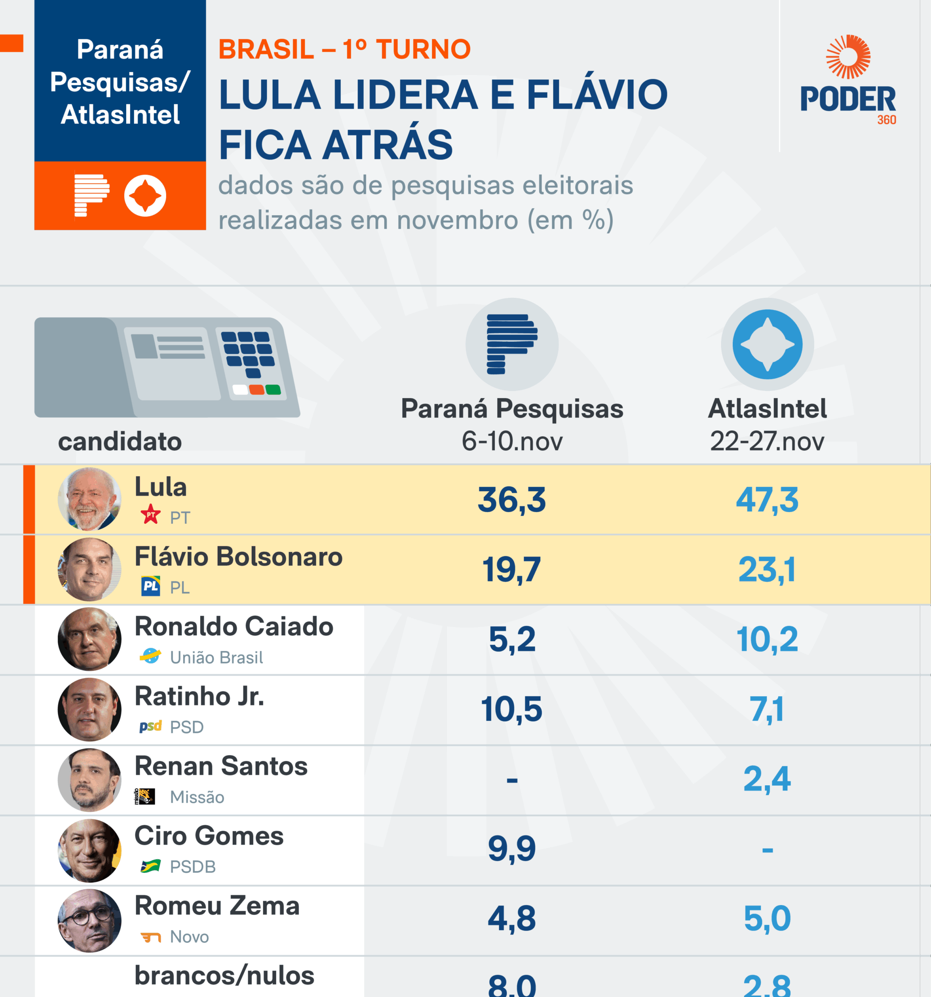 No cenário testado pela Paraná Pesquisas entre 6 e 10 de novembro, Lula soma 36,6% das preferências, enquanto Flávio alcança 19,7%. Já a AtlasIntel, que entrevistou eleitores de 22 a 27 de novembro, mostra o petista com 47,3% e o parlamentar fluminense com 23,1%.
