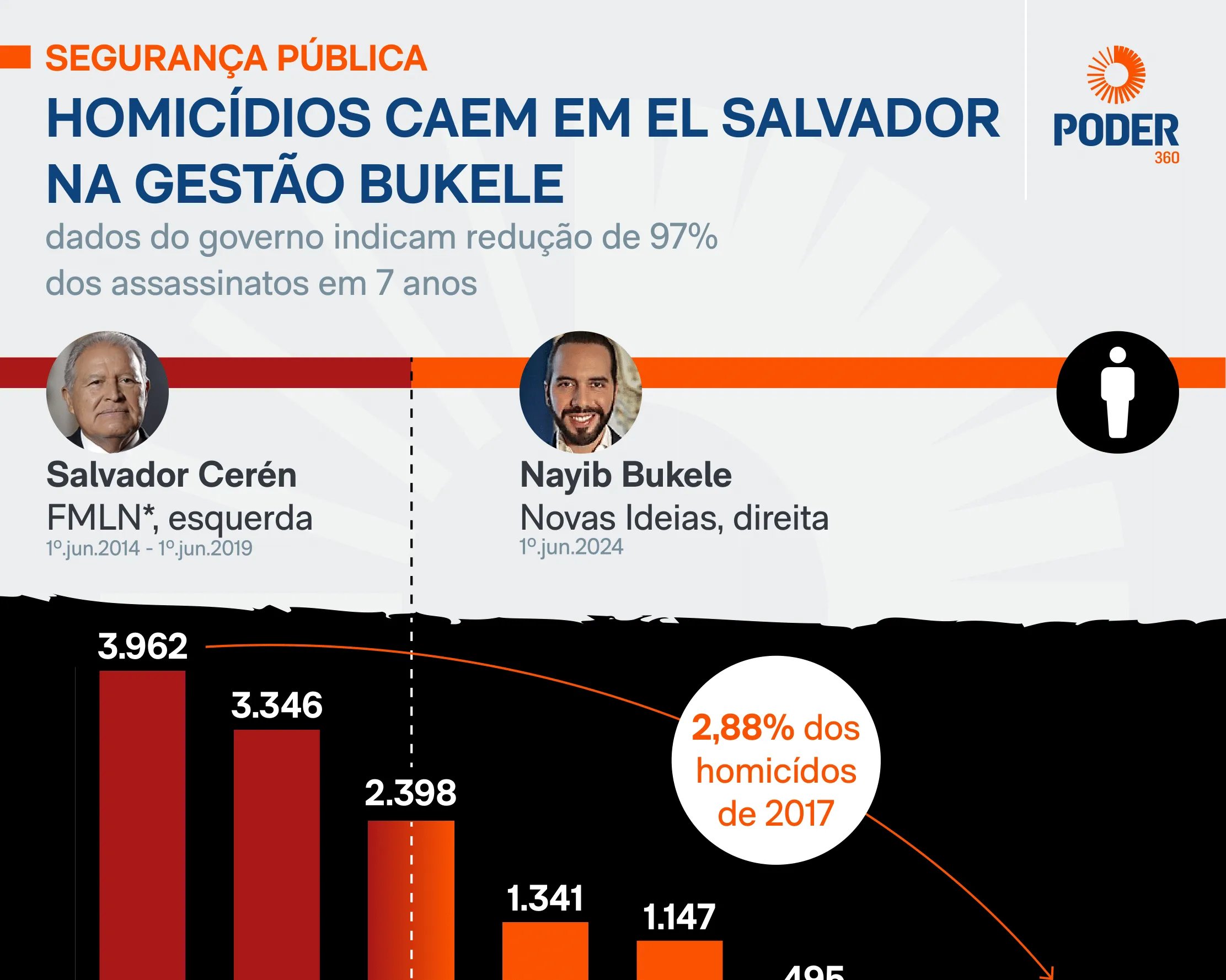 El Salvador registrava uma das maiores taxas de assassinatos da América Latina. Em agosto de 2015, foram 911 homicídios. Após Bukele assumir, os índices recuaram; dados oficiais indicam 114 mortes em 2024, contra 3.346 em 2018 — redução de 97 %.