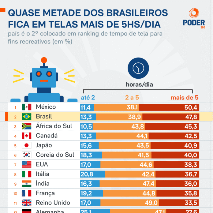O Brasil ocupa a segunda posição entre 14 países no tempo diário dedicado a telas para fins recreativos, segundo levantamento divulgado em dezembro pela Cisco e pela Organização para a Cooperação e Desenvolvimento Econômico (OCDE).