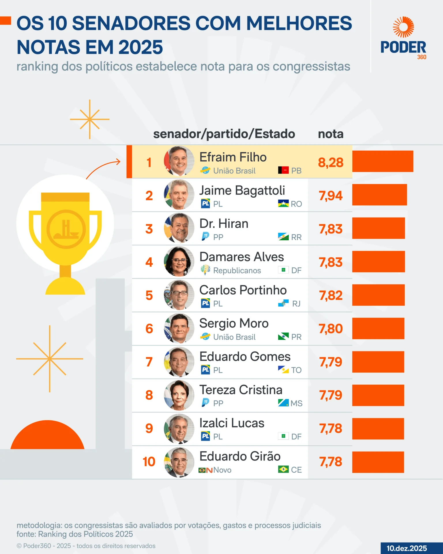 Entre os deputados, Van Hattem alcançou 8,61 pontos, seguido por Mendonça Filho (União-PE), Rodolfo Nogueira (PL-MS) e Adriana Ventura (Novo-SP). No Senado, Efraim Filho liderou com 8,28 pontos, à frente de Jaime Bagattoli (PL-RO) e Dr. Hiran (PP-RR).