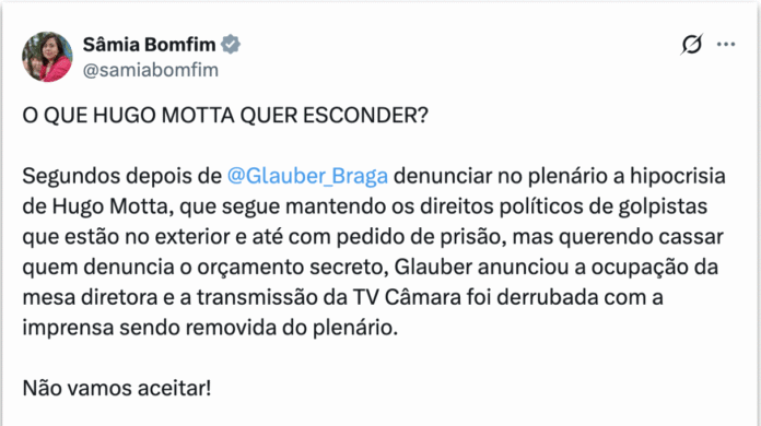 A deputada federal Sâmia Bomfim (Psol-SP) questionou nesta terça-feira, 9 de dezembro de 2025, a decisão do presidente da Câmara, Hugo Motta (Republicanos-PB), de interromper a transmissão da TV Câmara e ordenar a saída de jornalistas do plenário.