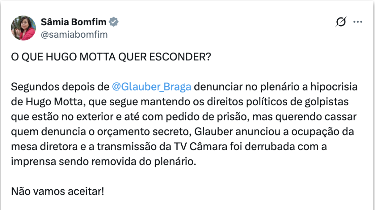 O protesto de Sâmia foi publicado na rede social X pouco depois de seu marido, o deputado Glauber Braga (Psol-RJ), ser retirado à força pela Polícia Legislativa da cadeira da presidência da Casa. Braga ocupava o assento em manifestação contra o processo de cassação que tramita contra ele desde abril de 2024, quando o Partido Novo apresentou denúncia por supostos confrontos físicos com Gabriel Costenaro, do Movimento Brasil Livre (MBL).