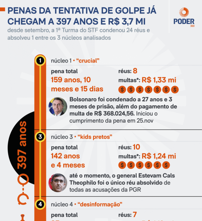 Brasília, 16.dez.2025 – O Supremo Tribunal Federal (STF) retoma nesta terça-feira (16.dez) o julgamento do quarto e último grupo de réus pela tentativa de golpe de Estado de 2022. Até o momento, a Corte impôs 397 anos de prisão e multas que totalizam R$ 3,7 milhões a 24 condenados, absolvendo apenas um acusado.