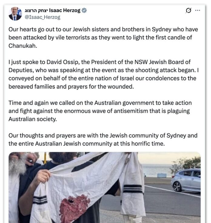 O presidente de Israel, Isaac Herzog, condenou o atentado e afirmou que judeus foram alvo “ao acender a primeira vela do Hanukkah”. Ele também cobrou ações mais firmes do governo australiano contra o antissemitismo.