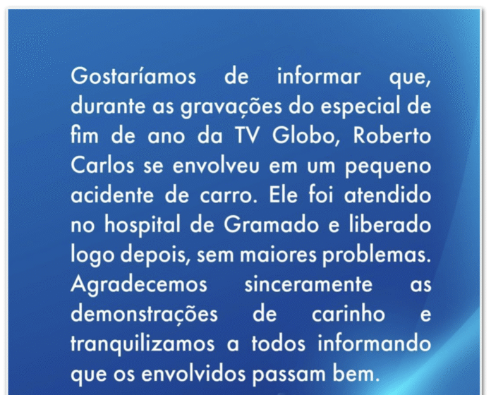 Em nota publicada no Instagram, a assessoria do cantor classificou o episódio como “pequeno acidente”, agradeceu as mensagens de apoio e descartou preocupações maiores.